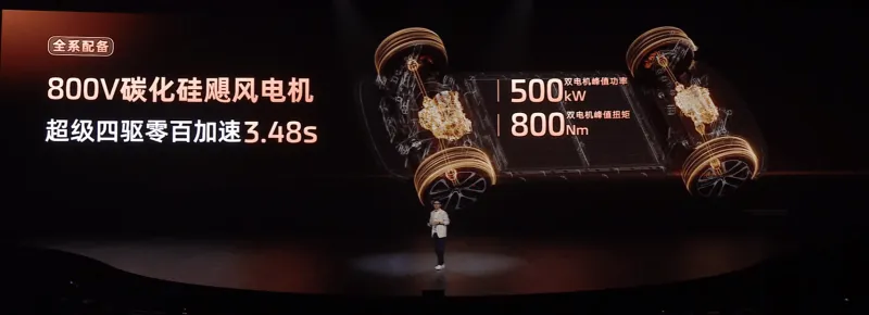 全系配备800VSiC飓风电机,双电机峰值功率可达500千瓦,峰值扭矩800牛・米,百公里加速仅需3.48秒。