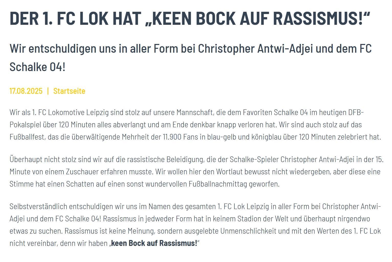 莱比锡火车头俱乐部也随后发表道歉声明:“我们谨代表全队向安特维-阿德杰伊和沙尔克04全队表示诚挚歉意!种族主义没有任何借口,它不是观点,而是不人道的行为,和我们俱乐部所秉持的价值观完全不符。我们坚决拒绝种族主义!”